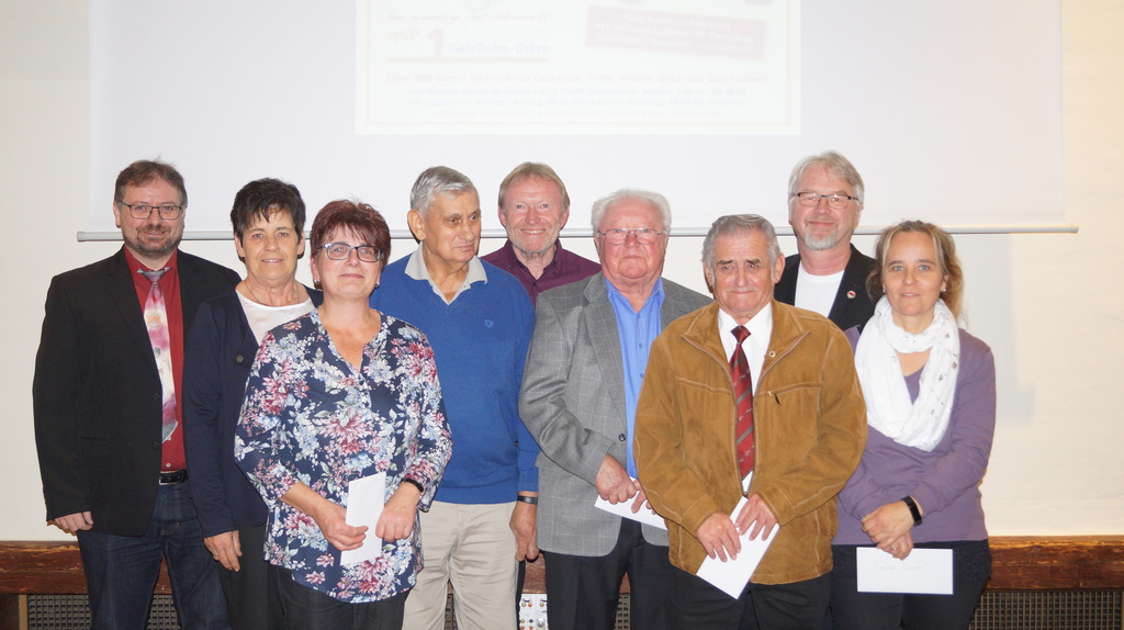 Vereinsehrennadel in Bronze an Helmut Buckel, Karin Lechler-Müller, Adrian Meyer, Magnus Müller, Philipp Müller, Ramona Müller, Werner Schenk und Robert Schürlein. Ein Vierteljahrhundert sind Peter