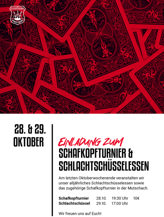 Freitag/Samstag 28./29.10.22 Schafkopfturnier und Schlachtschüssel im Sportheim