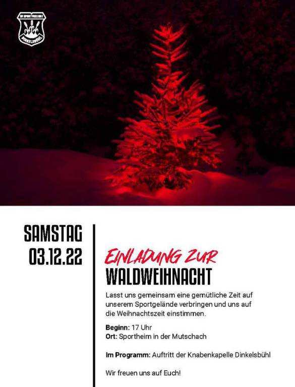 Die Sportfreunde Dinkelsbühl laden Mitglieder, Freunde, Gönner und die Bevölkerung herzlich zur Waldweihnacht vor dem Sportheim ein.