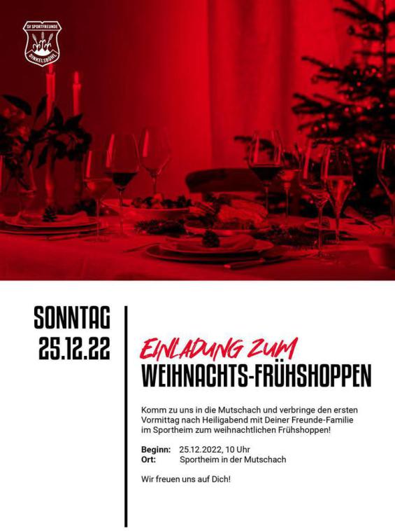 Sonntag, 25. Dezember 2022, ab 10:00 Uhr tradtioneller Weihnachtsfrühschoppen im Sportheim