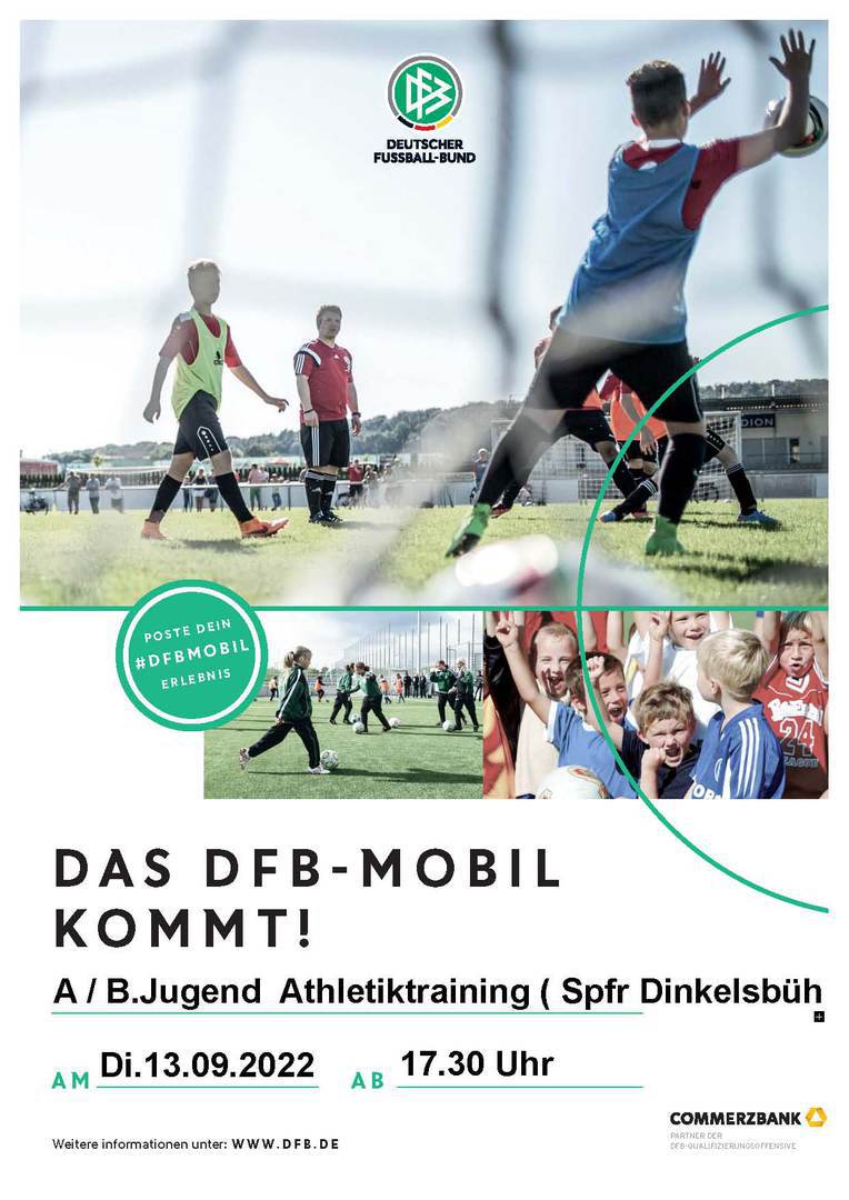 Dienstag, 13.09.2022, 17:30 Uhr, das DFB-Mobil kommt. Diesmal Schwerpunkt A/B Jugend Athletiktraining auf dem Kunstrasenspielfeld.